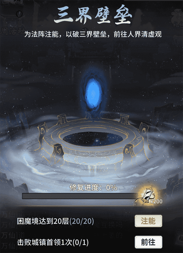 当你修为达到返虚/破虚中期后,,,,可在城镇寻得芸丫并激活神秘法阵,,通过收集材料、、击败首领等方式为法阵注能,,,借以打破三界壁垒,,,开启支线剧情“清虚旧梦”