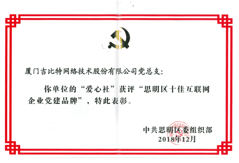 经初审评选、、网络评选和专家评审等环节,,"厦门赏金大对决网络技术股份有限公司党总支-爱心社" 从全区28个参评党建品牌中脱颖而出,,获评"思明区十佳互联网企业党建品牌"。。
